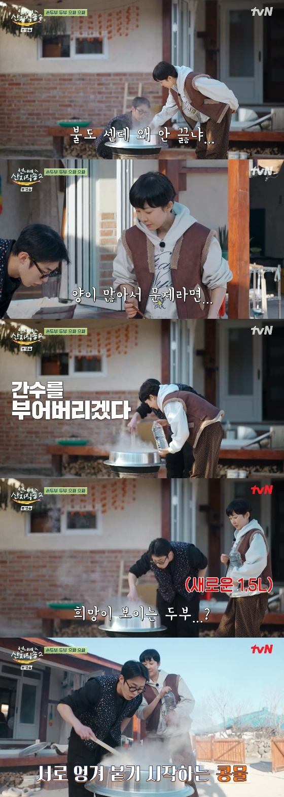 이날 염정아는 이재욱과 함께 호기롭게 손두부 만들기에 도전했으나 예상치 못한 위기로 멘붕에 빠졌다. 아무리 불을 때도 콩물이 끓지 않았던 것. 염정아는 "불이 센데 왜 안 끓냐"며 "연기만 자욱하고 끓지를 않는다"며 초조한 모습을 보였다.