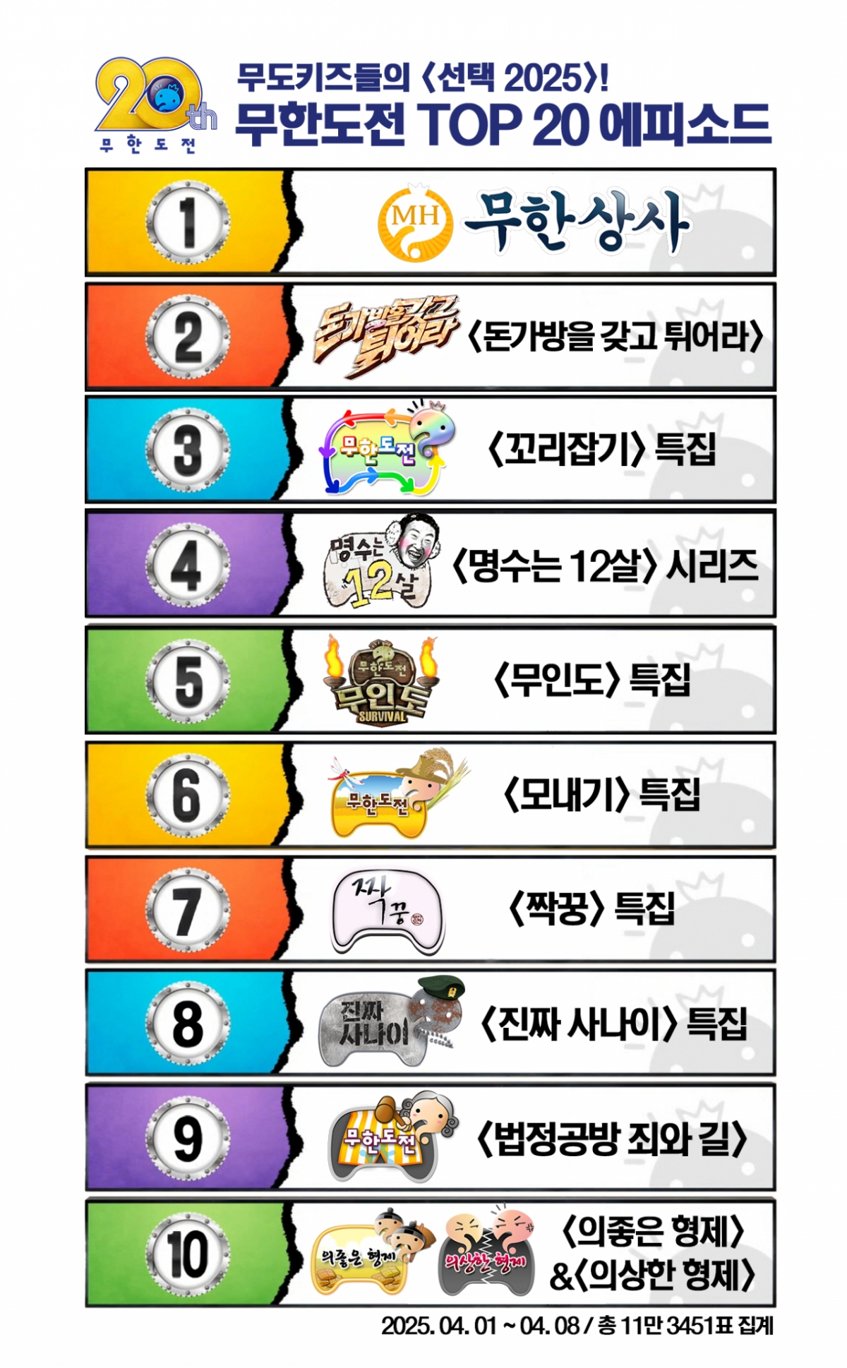 21일 MBC에 따르면 포털 사이트 네이버에서 진행된 '무한도전' TOP 20 에피소드 투표 결과, 총 11만3451표 중 6457표를 기록한 '무한상사' 시리즈가 1위를 차지했다. 이어 '돈가방을 갖고 튀어라', '꼬리잡기', '명수는 12살', '무인도' 특집 등이 차례로 2위부터 5위까지 차지했다.
