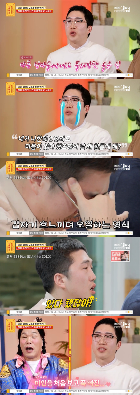 그는 "옥순이라는 괜찮은 여자가 있었는데 24기 인기녀였다. 첫날 옥순이 나한테 '쓰레기 정리하는 네 모습이 좋았다. 나랑 별 보러 가지 않겠냐'고 했다. 저는 그때부터 옥순이가 나를 좋아하나 싶었다. 그런데 첫 선택에서 한 표도 못 받아서 위축되고 눈물도 많이 흘렸다"고 설명했다.