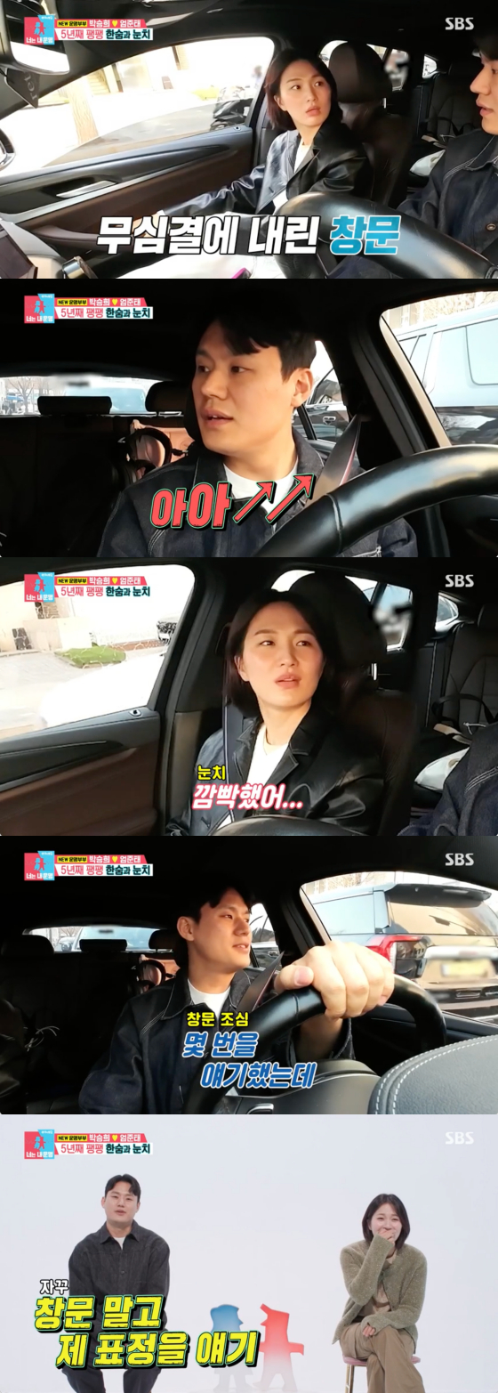 박승희는 제작진에게 "남편이 창문 내리지 말라고 10번 얘기하면 제가 5번을 내린다. 창문 내리는 순간 오만가지 생각이 다 든다. 그런데 자꾸 화를 내니까 눈치를 보게 된다"고 털어놨고, 엄준태는 "창문 내린 것에 대해 얘기해야 하는데 (박승희는) 자꾸 제 표정에 집중한다"고 반박했다.