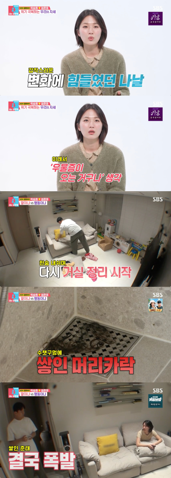 결국 엄준태는 박승희를 향해 "너 샤워할 때 이런 거 안 보이냐"며 머리카락을 들어보였고, 박승희는 "정말 안 보였다. 미안하다. 거실에 있는 옷도 내가 치우려고 했다 미안하다. 나한테 얘기하면 나도 치울 수 있으니까 얘기해달라"고 사과했다.