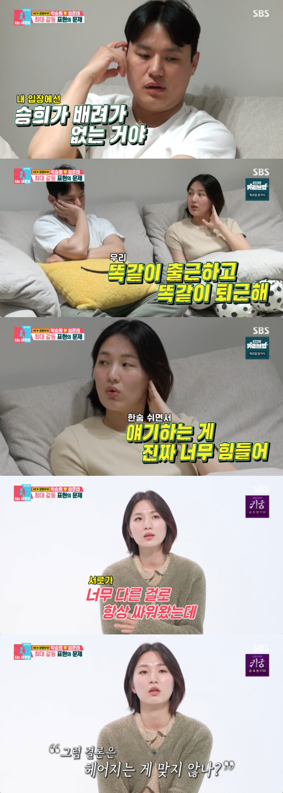 이후 박승희는 제작진과 인터뷰에서 "다른 생활 습관으로 항상 싸워왔다. 남편과 사이가 좋고 싶은데 해결할 방법을 정말 모르겠다. 이게 해결이 안 되면 못 살 것 같고, 결론은 헤어지는 게 맞지 않나 싶었다"고 말했다.