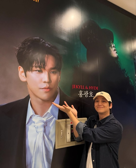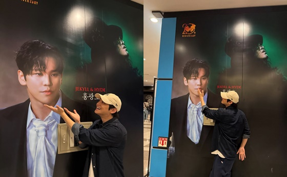 공개된 사진 속 김범은 캐주얼한 볼캡에 편안한 셔츠 차림으로 뮤지컬 홍보 포스터 앞에서 양손으로 홍광호의 모습을 가리키고 있다.