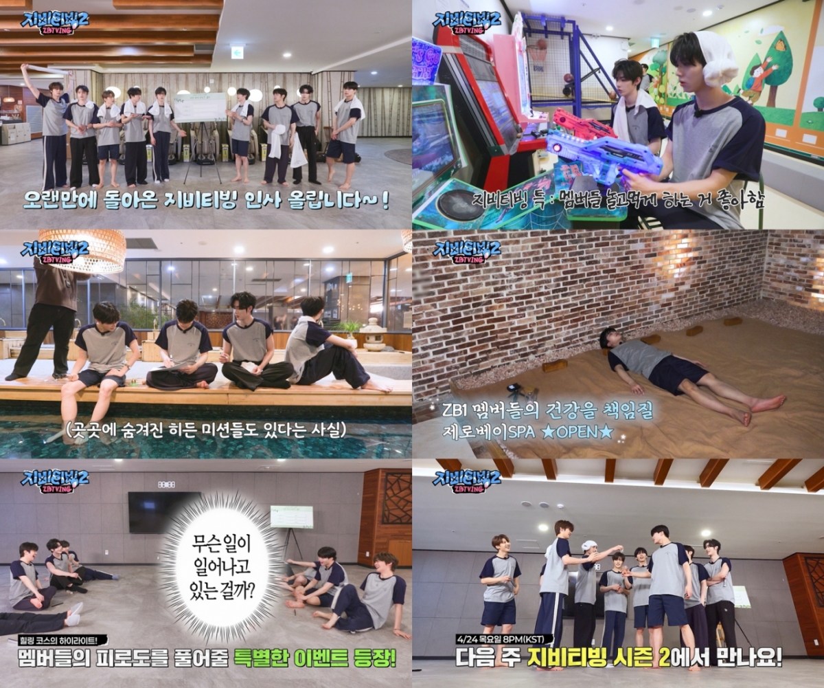 최근 공개된 '지비티빙' 시즌2 첫 번째 에피소드의 예고편에 따르면, 본편 공개에서는 제로베이스원의 찜질방 정복기가 그려질 예정이다. 매 순간 힘차게 달려온 아홉 멤버의 스트레스와 피로를 모두 날려버릴 '제로베이SPA'가 전격 오픈된다.
