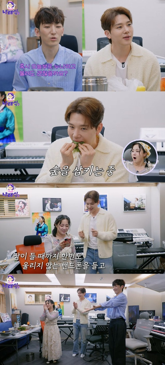 이어 박나래는 "두 분 다 워낙 먹는 걸 좋아하더라"라며 수육부터 꼬막 비빔밥, 홍합탕까지 출장 뷔페급 푸짐한 배달식을 준비했다. 배달식 첫 장소는 멜로망스의 작업실. 박나래는 거친 숨을 몰아쉬며 작업실까지 직접 요리를 배달했다.