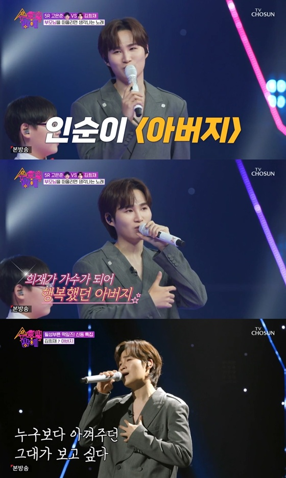 이날 인순이의 '아버지'를 선곡한 김희재는 "아버지도 어렸을 때 꿈이 가수였고, 제가 가수가 됐을 때도 무척 기뻐하셨다"라며 "아버지 덕분에 저도 가수가 될 수 있었다"라고 선곡 이유를 밝혔다.