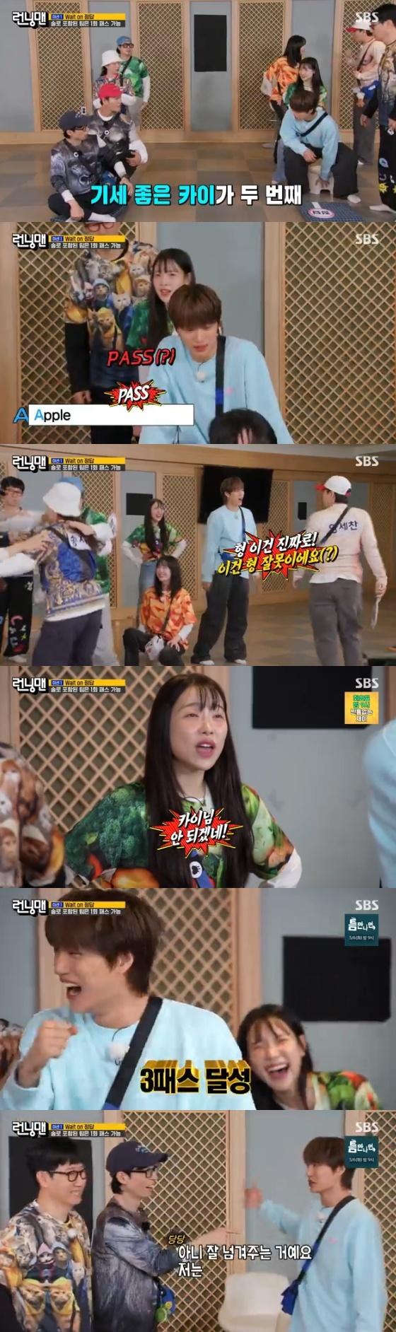 알파벳 'A'로 시작하는 영어단어를 말하는 퀴즈에서 첫 번째 주자인 양세찬은 'Apple'를 말했으나 카이는 자신 있게 '패스'를 외쳤다. 또 알파벳 'C'로 시작하는 영단어를 대는 퀴즈에서도 또다시 '패스'를 외쳐 '패스 전문 보이'로 등극했다.