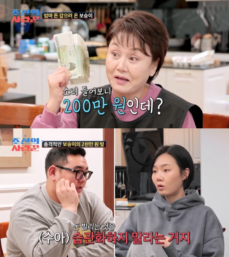 또, 몇 달 전 이경실에게 200만 원을 빌린 바 있는 손보승은 본가로 당당하게 금의환향했다. 돈 갚을 타이밍을 재던 손보승은 200만 원 현금을 신권과 구권 혼합으로 엄마에게 건넸다. 빳빳한 신권을 제외하고 나머지는 다시 계좌로 입금해 준다는 말에, 이경실은 "돈 앞에서는 부모 자식도 없다"며 현금을 품에 넣었다. 하지만 촬영으로 인해 3일 만에 귀가한 누나 손수아와 함께 커피타임을 가지던 중, 누나도 몰랐던 빌린 돈 '2,000만 원' 문제가 대두됐다. 2년 전 손보승은 유튜브를 한다며 이경실에게 2,000만 원을 빌린 바 있었다.