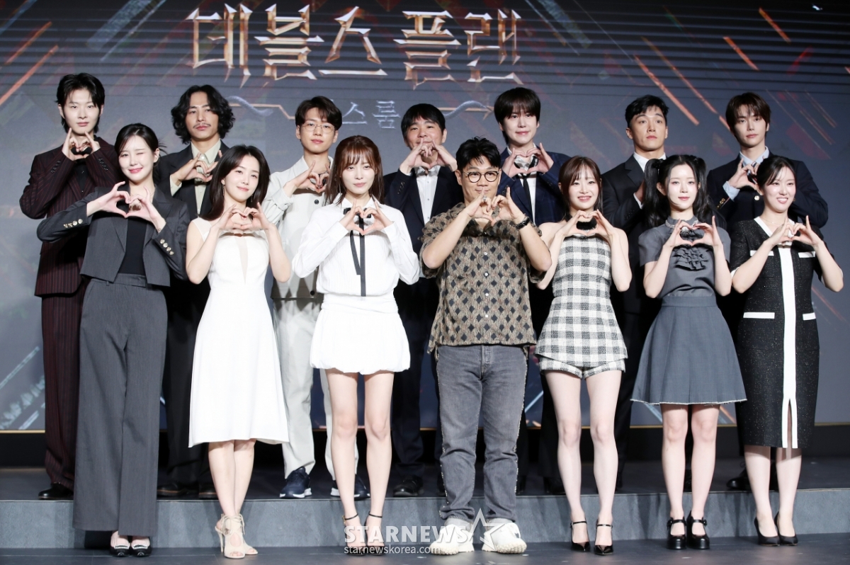 모델 최현준, 보드게임 유튜버 티노, 박상연, 이세돌 전 프로바둑기사, 가수 규현, 세븐하이, 정현규, 손은유, 김하린, 츄, 정종연 PD, 윤소희, 강지영, 이승현(뒷줄 왼쪽부터 시계방향)이 29일 오전 서울 마포구 호텔나루에서 열린 넷플릭스 '데블스 플랜: 데스룸' 제작발표회에 참석해 포즈를 취하고 있다.
