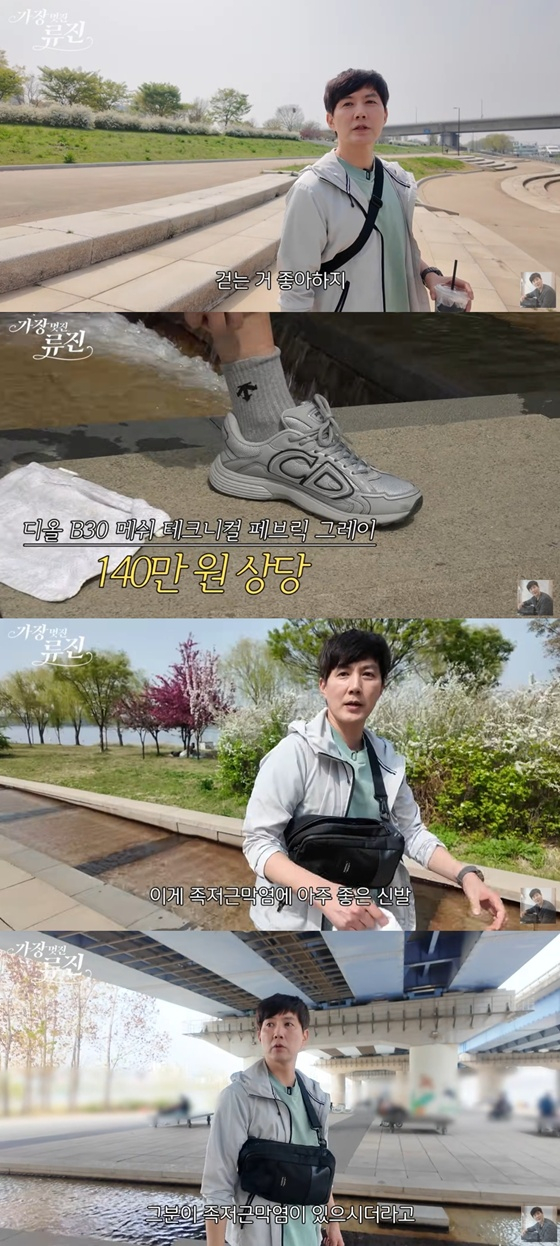 한강을 걷던 중 140만 원 상당의 명품 신발이 눈길을 끌었다. 류진은 "이게 족저근막염에 아주 좋은 신발"이라며 "동네 병원에 갔는데 병원 원장님이 신발에 진심이더라. 그분도 족저근막염이 있으시더라"라고 전했다.