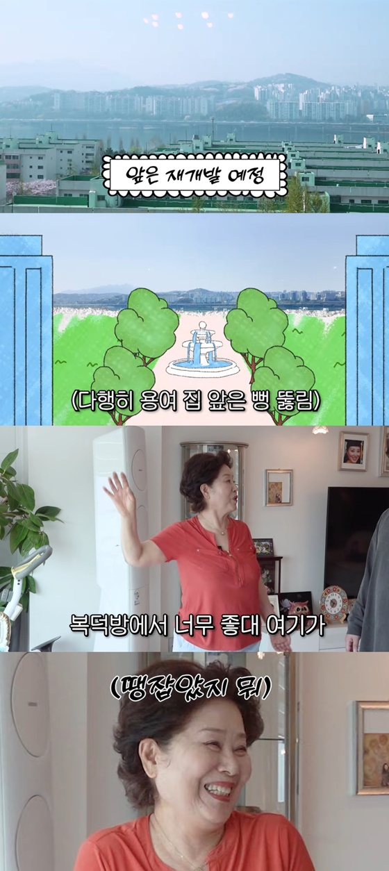 선우용여는 재개발을 앞둔 집 앞쪽에 도로가 깔린다며 "앞이 철거돼서 길이 난다고 하더라. 복덕방에서 여기가 좋다고 하더라"고 말했다.