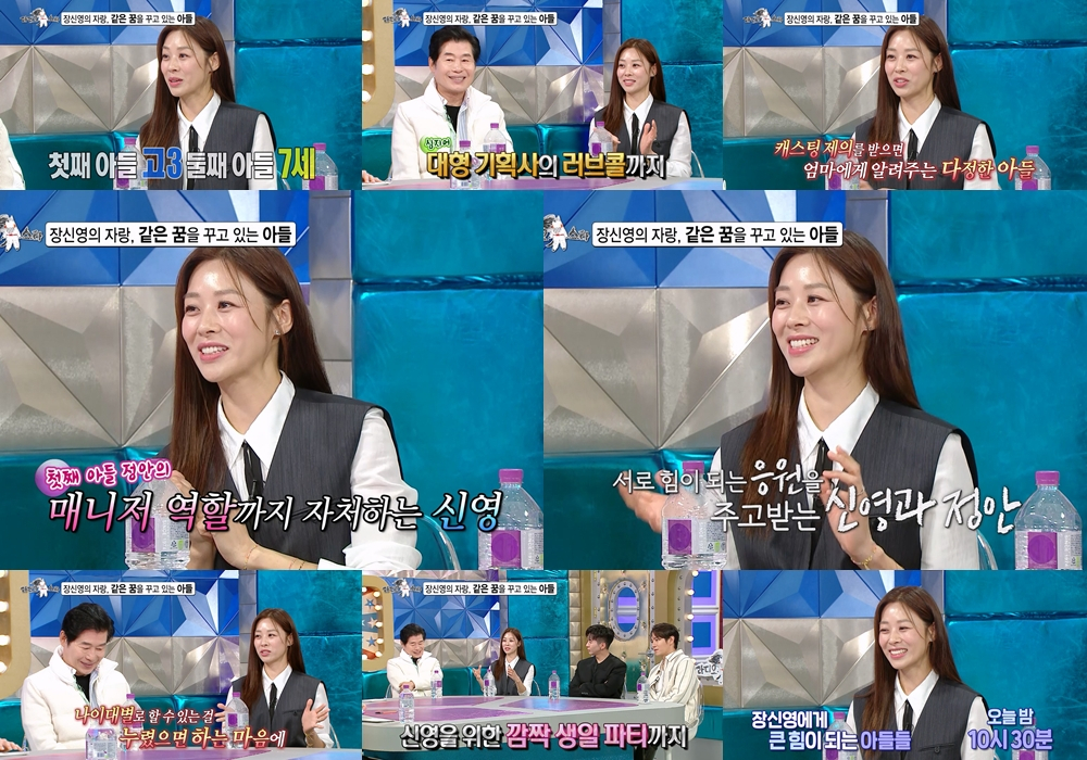 '라디오스타'에서 배우 장신영이 두 아들에 대한 자랑을 쏟아낸다. 그는 자신과 같은 연기자의 꿈을 키우고 있는 '고3' 첫째 아들이 길거리 캐스팅은 물론 대형 기획사의 러브콜까지 받은 사연을 밝혀 눈길을 사로잡는다.