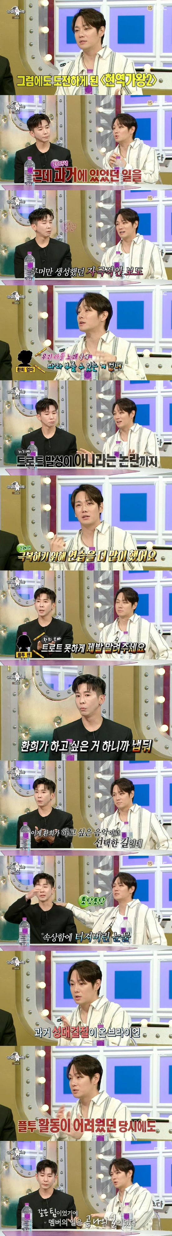 이날 환희는 최근 '트로트 가수'로 거듭난 이색 행보에 대해 언급했다. 그는 지난해 11월 방송된 MBN 트로트 서바이벌 예능 '현역가왕2'에 도전, 뜨거운 화제를 모은 바 있다.