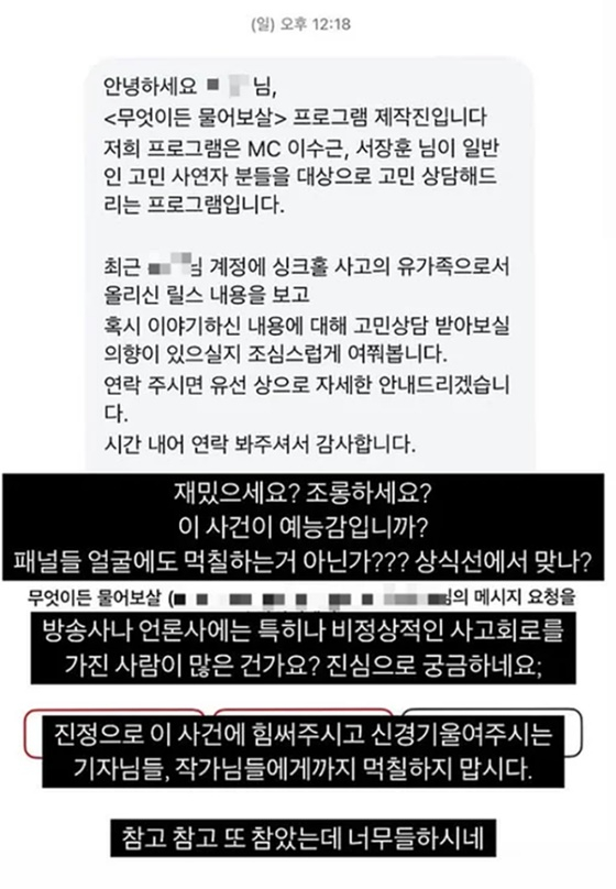 제작진은 유족에게 "싱크홀 사고의 유가족으로서 올리신 릴스 내용을 보고 혹시 이야기하신 내용에 대해 고민 상담 받아보실 의향 있으실지 조심스럽게 여쭤본다"며 섭외를 제안했다.