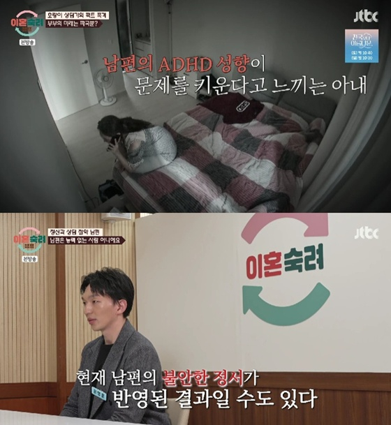 ADHD 검사를 진행한 남편. 이광민 정신과 전문의는 "집중력 검사에서 전반적으로 떨어지는 걸로 나왔다. 어디까지나 현재 집중력이 떨어졌다는 거다. 불안, 긴장, 초조 등으로도 떨어질 수 있다"며 "특징적인 건 청력 관련 검사에서만 월등히 좋게 나온다. 아내 지시 사항이 많다 보니까 불안 때문에 예민해진 거 같다. 아내가 일정 부분, 남편을 가스라이팅 하는 것도 있다. 본인 그렇게 능력 없는 사람이 아니다. 마음에 상태 때문에 이런 상태가 도드라진 것"이라고 전했다.