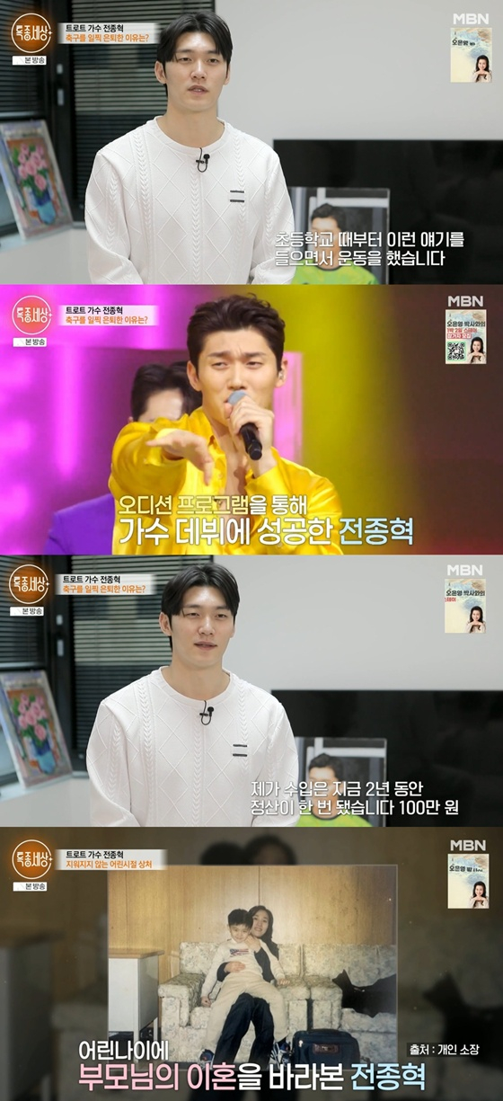 이후 선수 생활을 은퇴한 전종혁은 '불타는 트롯맨'에 출연해 가수 데뷔하는 데 성공했다. 그러나 가수 생활도 녹록지 않았다. 그는 "계속 무대에서 노래하고 TV에 나오면 돈을 많이 버는 직업인 줄 알았다. 수입은 2년 동안 정산이 한 번 됐다. 100만원"이라며 "축구하는 동안 벌어놓은 돈으로 살다가 생활비라도 벌기 위해 배달 알바를 시작하게 됐다. 요즘에는 배달 아르바이트가 주 수입이 됐다"고 털어놨다.
