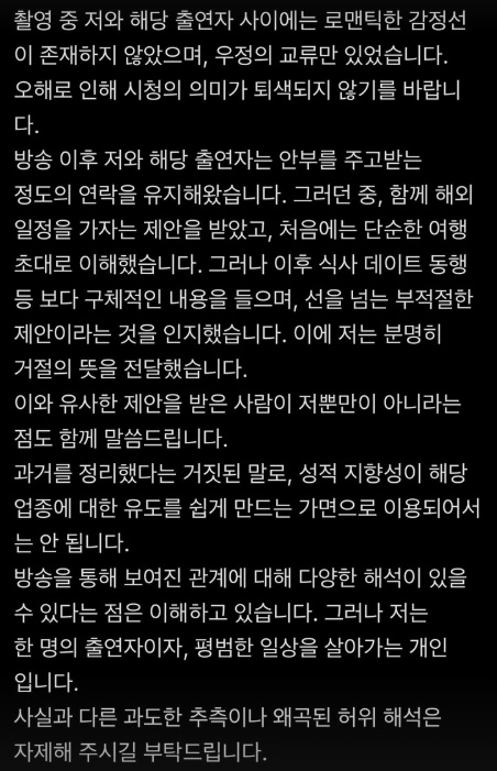 그는 "과거를 정리했다는 거짓된 말로, 성적 지향성이 해당 업종에 대한 유도를 쉽게 만드는 가면으로 이용되어서는 안 된다"라며 "방송을 통해 보인 관계에 대해 다양한 해석이 있을 수 있다는 점은 이해하고 있다. 그러나 저는 한 명의 출연자이자, 평범한 일상을 살아가는 개인이다. 사실과 다른 과도한 추측이나 왜곡된 허위 해석은 자제해 주시길 부탁드린다"라고 했다.
