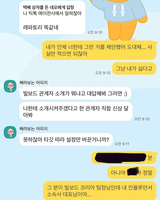 이후 리원은 "현재 타 출연자가 올린 스토리 내용은 전부 사실이 아니"라며 한결의 주장을 부인했다. 그러면서 '너의 연애' 출연자와 나눈 카카오톡 일부 대화를 캡처해 공개했다. 하지만 공개된 대화에서 최시훈의 이름이 언급됐다. 리원은 "끝까지 아꼈다느니 나랑 유사연애하네. 빌보드 관계자 소개가 뭐냐고 대답해봐 그러면. 나한테 소개시켜주겠다고 한 관계자 직함 신상 달아봐 못하잖아"라는 상대방의 말에 "아니야, 정말 그분이 빌보드 코리아 팀장님인데 내 인플루언서 소속사 대표님"이라고 설명했다. 해당 대화에서 최시훈의 이름은 모자이크 처리됐다. 하지만 네티즌들이 캡처본의 사진 밝기를 키운 결과 "최시훈이야. 에일리 남편 분"이라는 내용이 담긴 것으로 알려졌다.