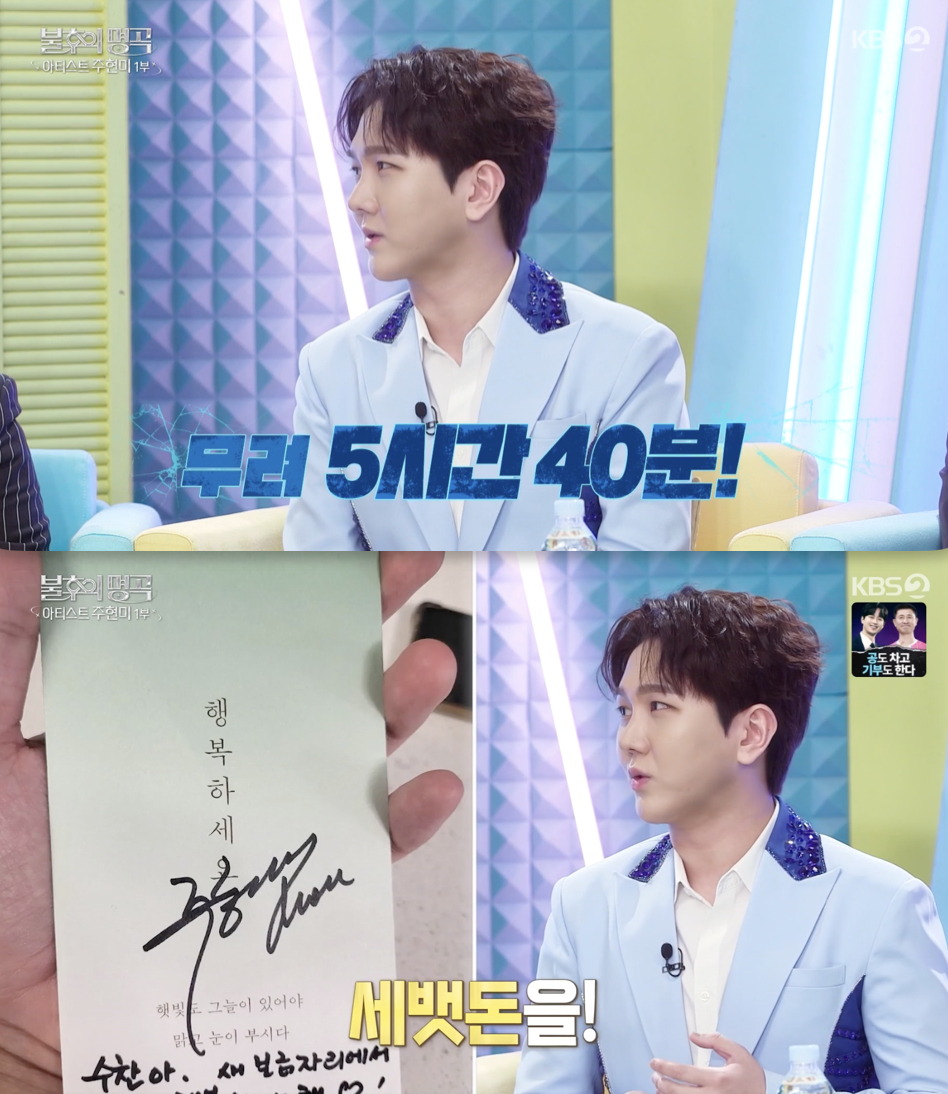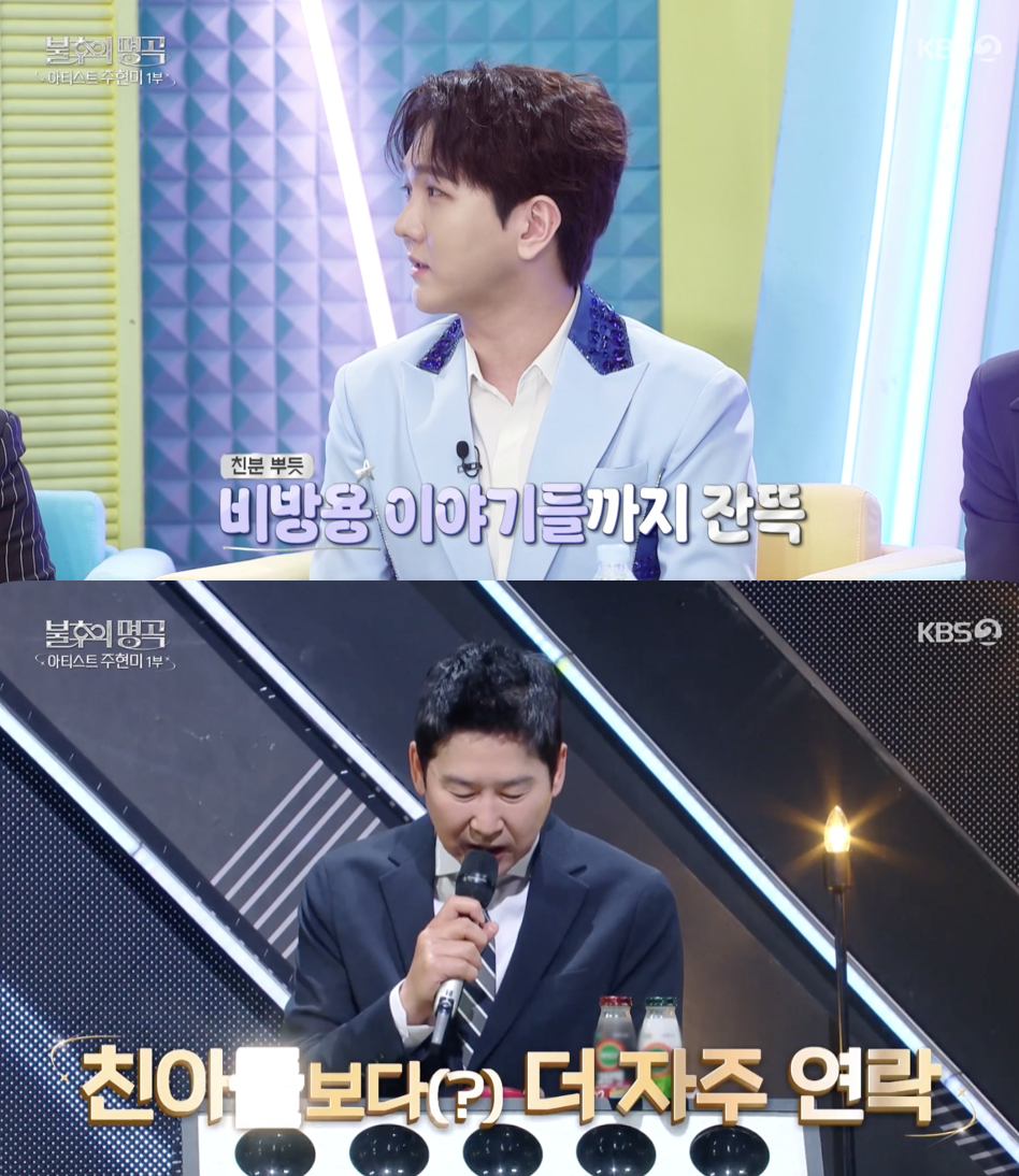 이날 김수찬은 과거 주현미와 듀엣곡을 발매하며 음악방송에 함께 출연한 인연을 소개했다. 이어 "연초에는 세뱃돈도 받았다"며 "통화도 자주 하는 사이"라고 남다른 친분을 자랑했다.