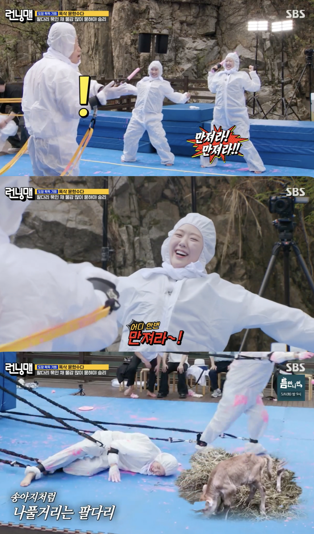 반면 송지효는 탄탄한 힘으로 고무밴드 저항을 이겨내며 전진했고, 이를 지켜보던 멤버들은 "여자 김종국"이라며 감탄했다.