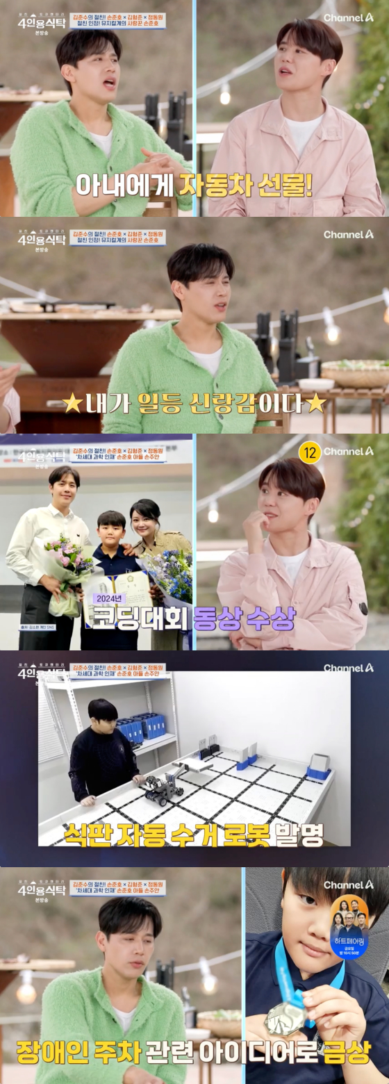 이에 대해 손준호는 "내가 맹장 수술로 입원했을 때 주안이가 고생하는 엄마를 보며 식판 나르는 기계를 발명했다. 그리고 장애인 주차 관련 아이디어로 금상을 받았다"고 설명했다.