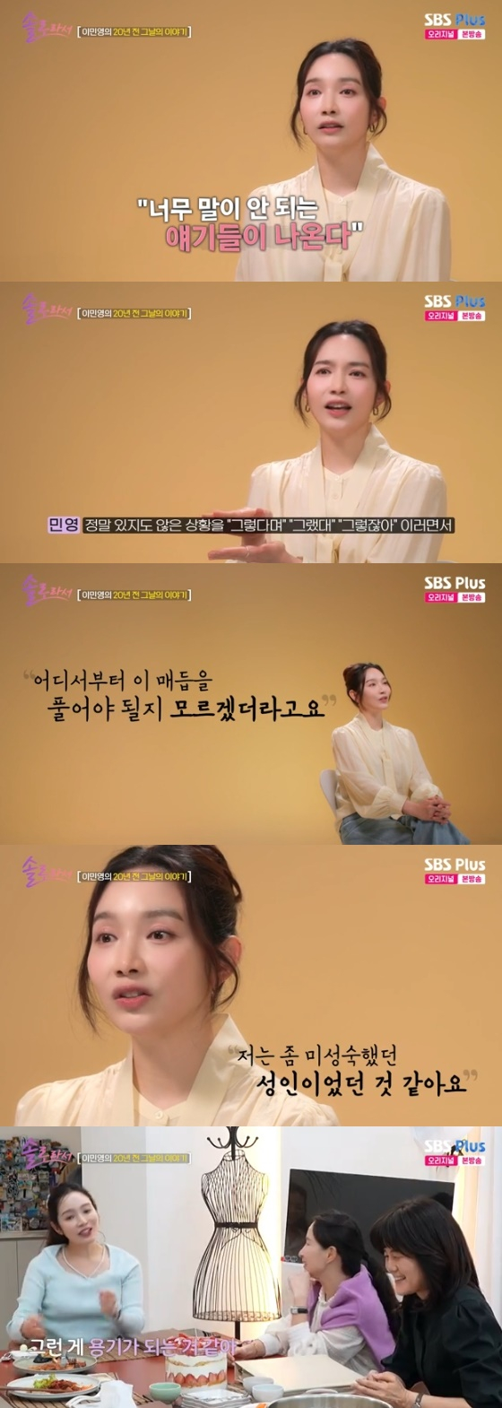 이민영은 "좋아하면 표현해야 하는 데 적극적으로 표현을 못 했다. 마음에 안 드는데도 '네, 네'했다"고 말했고, 친구들은 "그런 게 한 두 번이냐"고 받아쳐 웃음을 자아냈다.