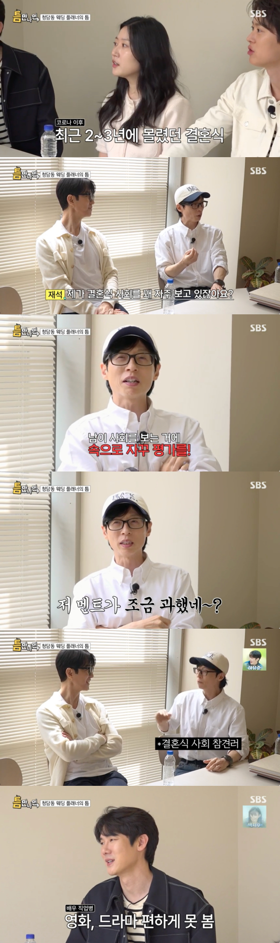 이를 들은 유재석 역시 "저도 결혼식 사회를 꽤 오래 보고 있기 때문에 남이 사회 보는 모습을 보면 속으로 자꾸 평가를 하게 된다"고 고백했다.