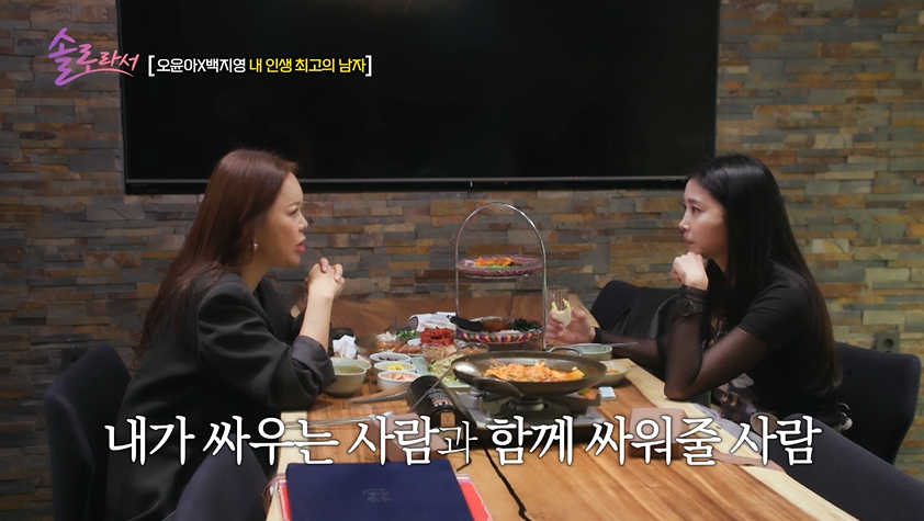 직후, 오윤아는 "언니는 결혼 생활을 어떻게 유지해?"라고 물었다. 백지영은 "관계에 있어서 절대 일방은 없다. 다 쌍방이다. 남편이 나한테 잘 하니까 나도 잘 하는 거다. 그리고 아직까진 남편이 너무 좋다. '내 사전에 이혼은 없다'는 마음으로 살고 있다"고 솔직하게 밝혀 공감을 자아냈다.