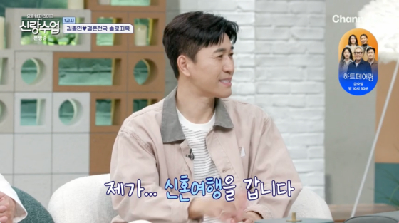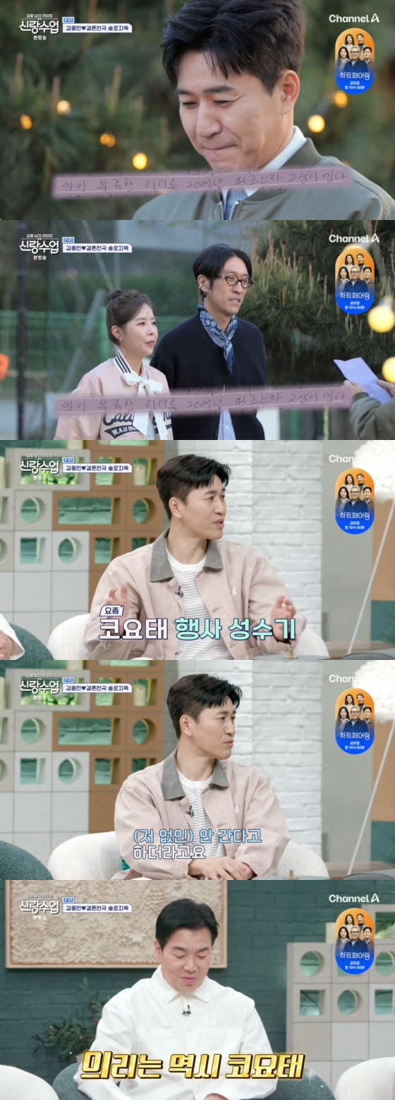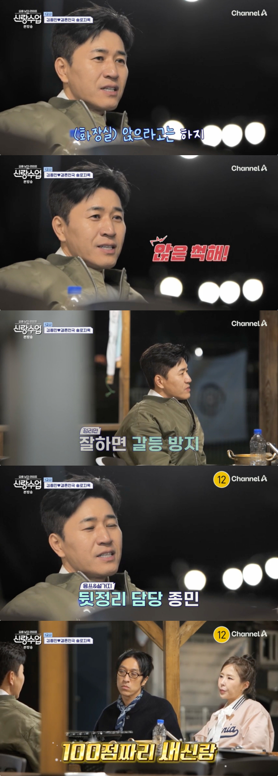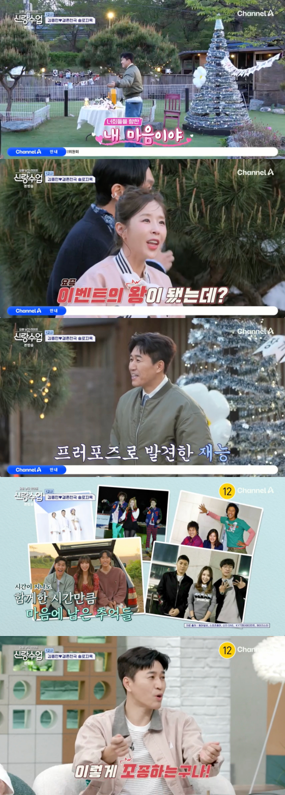 7일 방송된 채널A 예능 프로그램 '요즘 남자 라이프 - 신랑수업'에서는 새 신랑 김종민이 신지, 빽가에게 고마운 마음을 전하는 모습이 그려졌다.