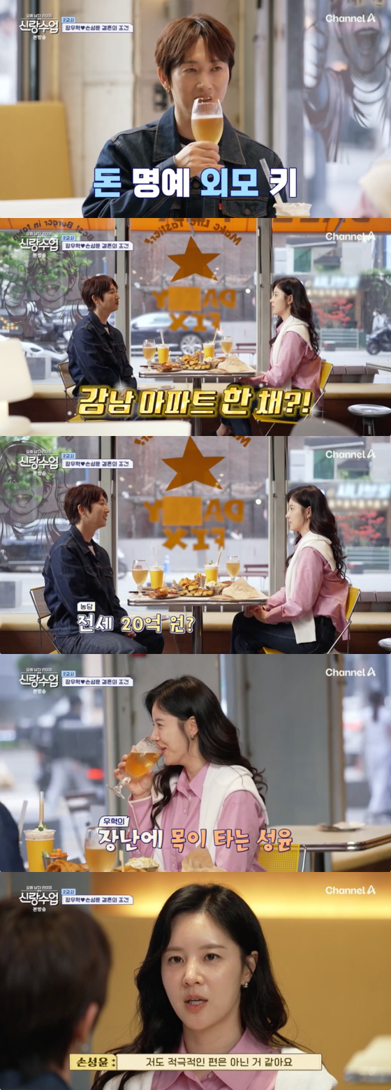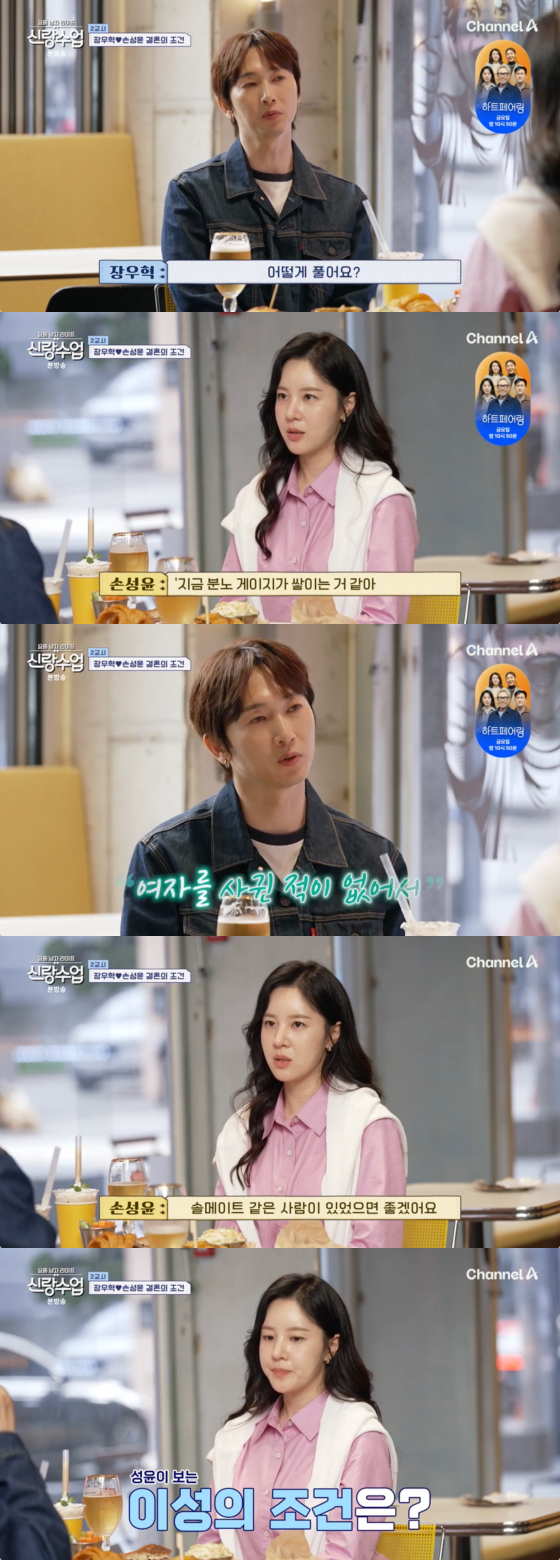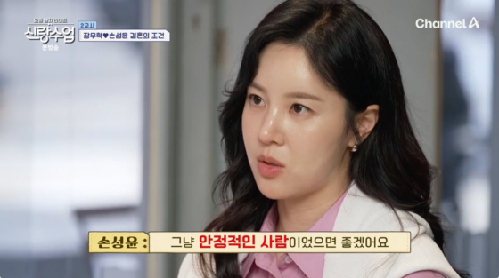 장우혁이 "원하는 조건 같은 게 있냐"고 묻자 손성윤은 "인성이 가장 중요하다. 돈이 아니라 그냥 안정적인 사람이면 좋겠다"고 말했다.