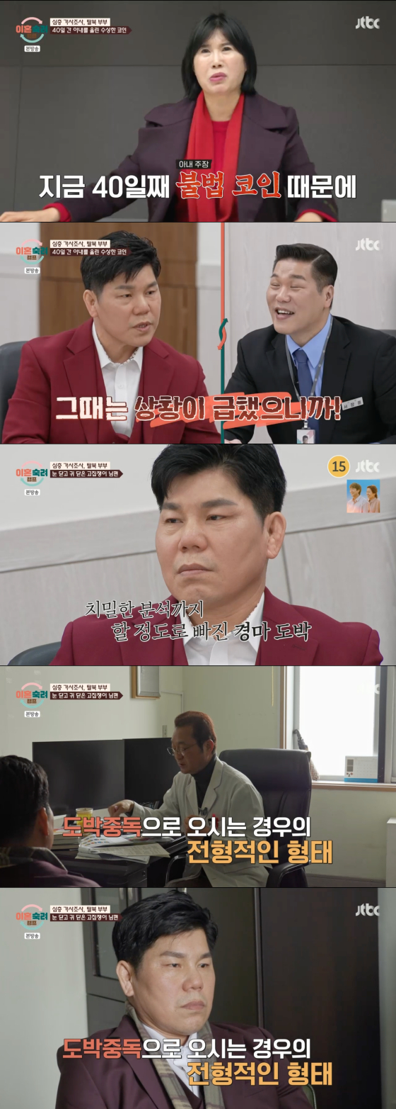 심지어 남편과 아내는 불법 코인으로 인해 한 달 넘도록 대치 중인 상태였다. 아내는 "남편이 불법 코인을 해서 40일째 싸고 있다. 나를 40일째 울렸다. 남편이 코인 다단계 수업을 받으러 다니더라. 아무리 봐도 말도 안 되는 수익 구조였다"며 남편이 코인 사기를 당했다고 주장했다.