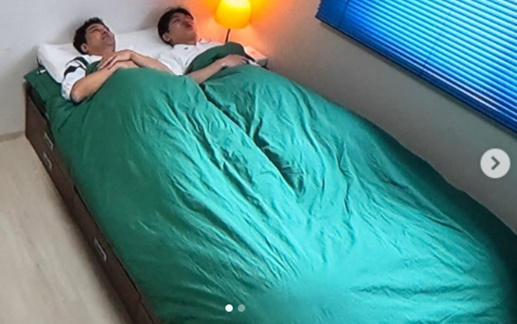 공개된 사진 속 전현무와 이주승은 이주승의 집에서 침대에 함께 누워 남다른 초록색 이불을 덮고 있다. 병원을 떠올리게 하는 이불의 강렬한 색감에 눈길이 간다.