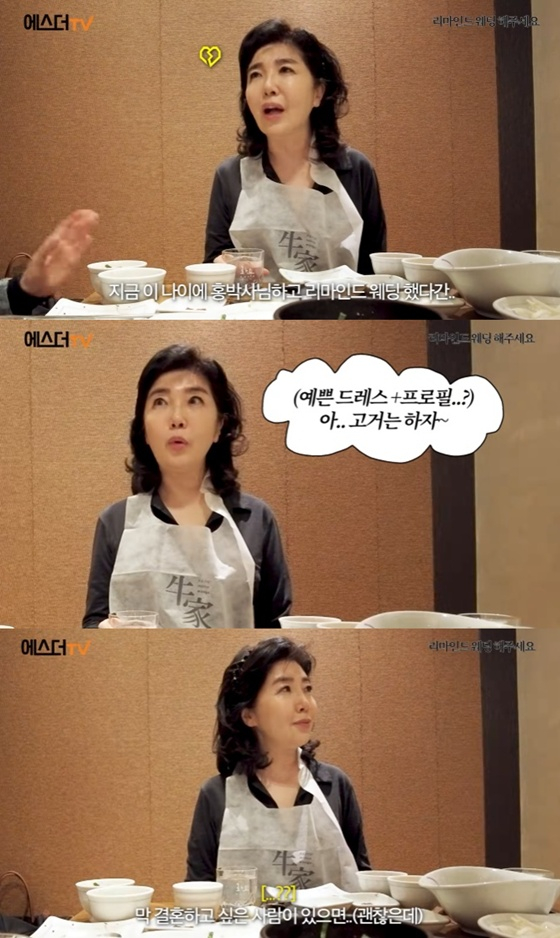 이날 여에스더는 직원들과 회식 중 "나한테 리마인드 웨딩하라고 하지 말아라"라며 "내가 지금 (남편과) 30년 살았는데, 지금 이 나이에 홍 박사님 하고 리마인드 웨딩했다가는"이라고 말했다.