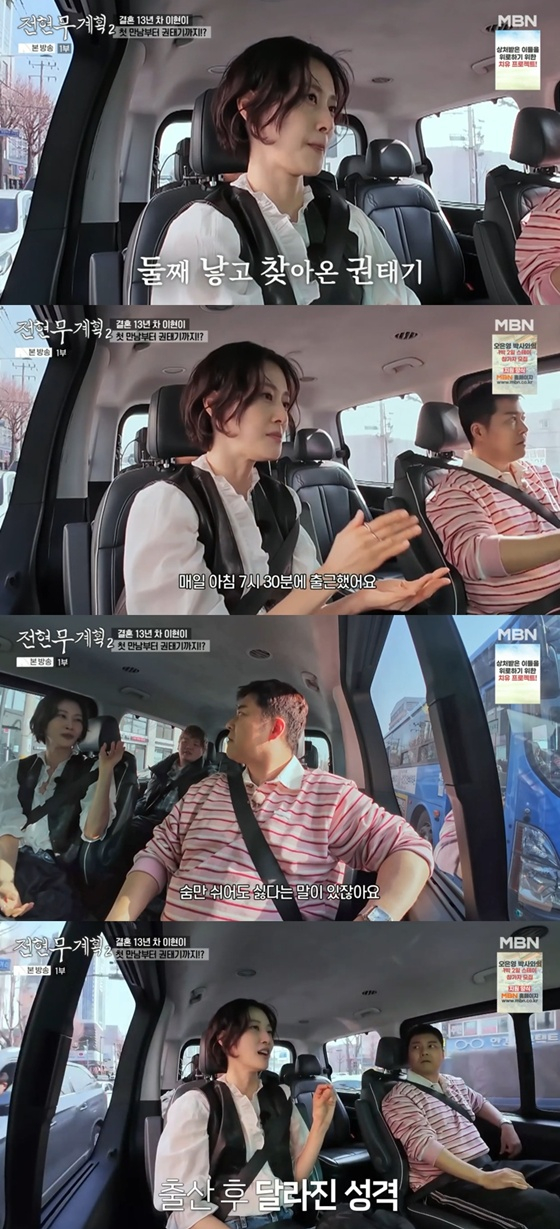 이날 이현이는 "둘째 낳고 극심한 권태기가 왔다. 우리는 프리랜서이지 않나. 그런데 우리 남편은 매일 아침 7시 30분에 출근했다"고 말문을 열었다.