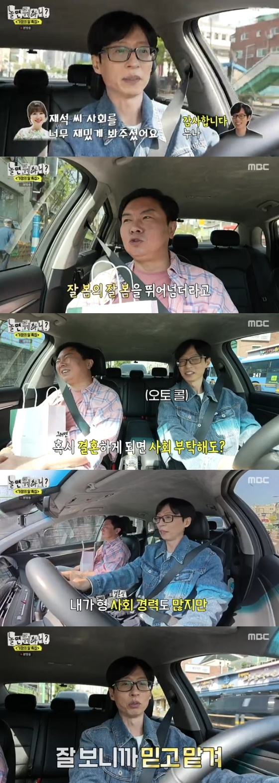 유재석은 임원희를 태워 목적지로 향하던 중 최근 김종민의 결혼식에서 사회를 맡았던 일을 언급하며 "내 사회 어땠느냐"고 질문을 던졌다.