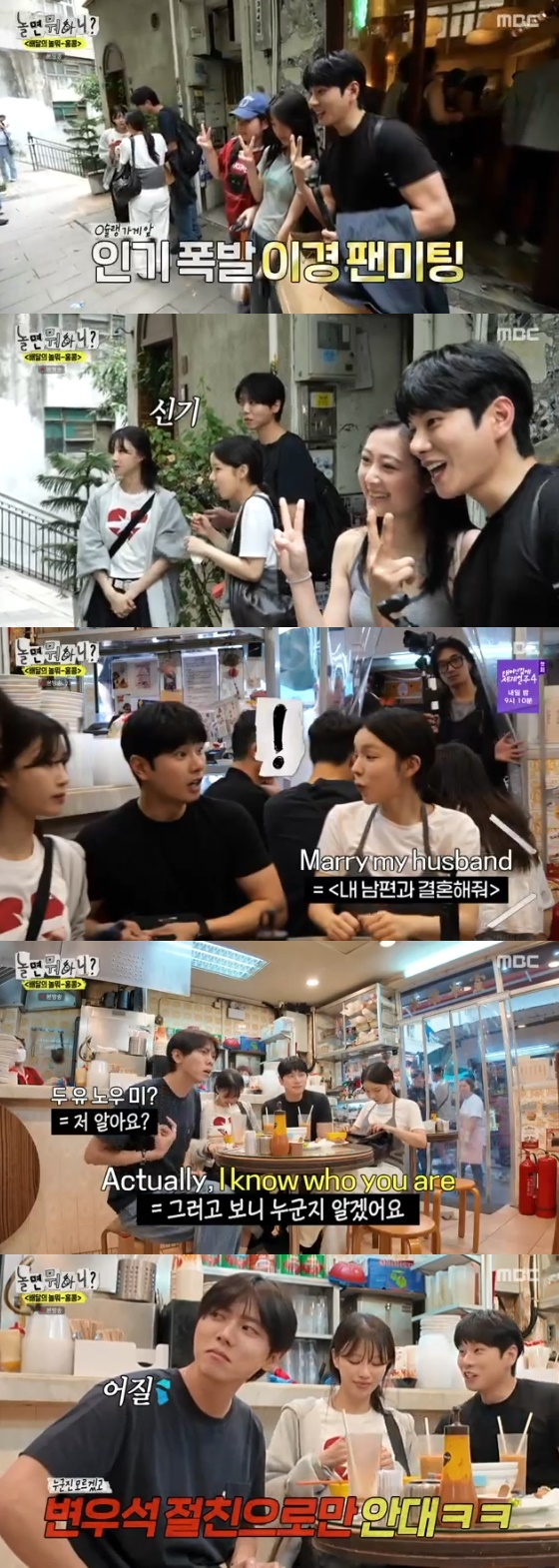 한편 해당 팬은 주우재를 한참 바라보다가 "그러고 보니 저 누군지 알겠다. 변우석 베프잖아요"라고 말해 웃음을 자아냈다. 이이경은 "변우석 절친으로만 알고 있대"라고 농담을 던졌고, 팬은 "죄송한데 이름은 진짜 모르겠다"고 사과해 멤버들을 폭소케 했다. 이에 주우재는 "내가 한국에서 변우석 친구로 통하는 건 그러려니 하는데 이게 세계로 가면..."이라고 한숨을 쉬었다.