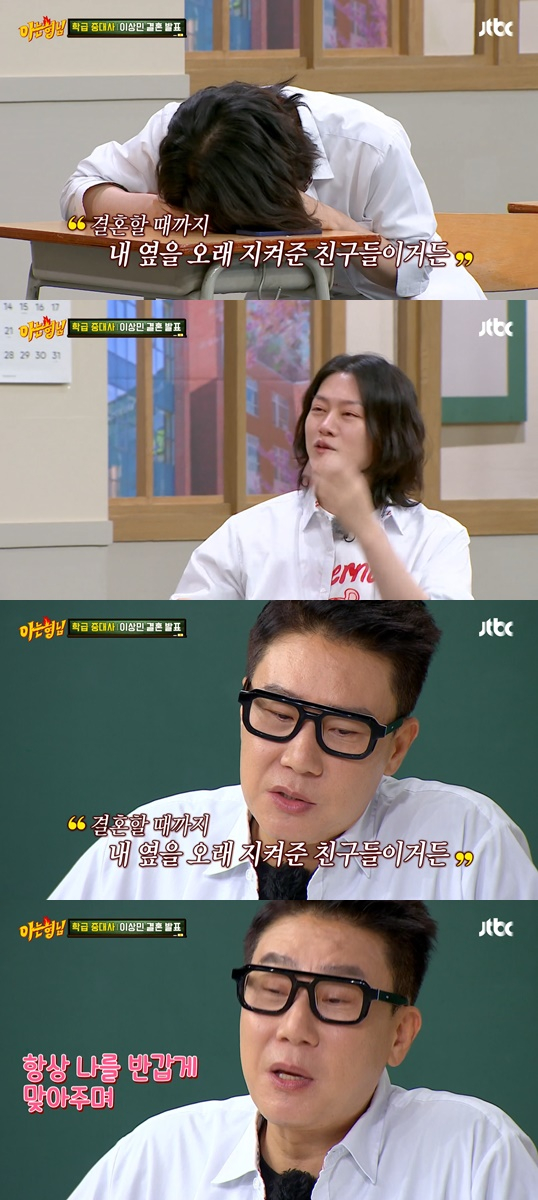또 이상민은 결혼 소식을 전하며 "'아는 형님' 멤버들을 향한 마음이 특별하다. 10년간 매주 보면서 항상 반갑게 맞아줘서 감사하다. 결혼할 떄까지 내 곁을 지켜준 친구들에게 고맙다"라고 말했다. 이상민의 말은 들은 김희철은 눈물을 흘렸다.