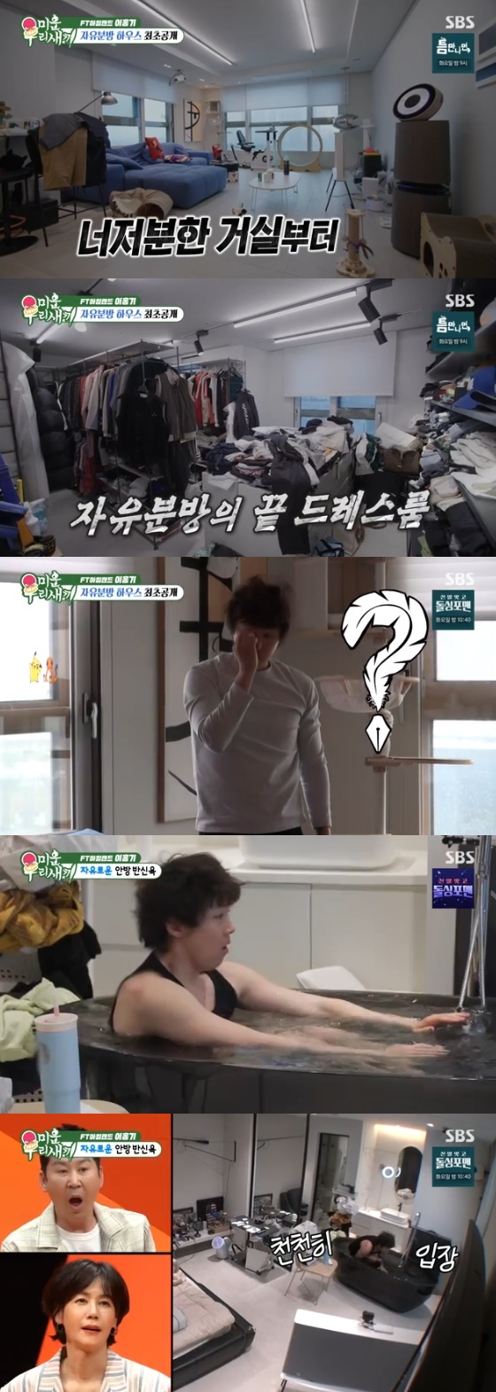 곧이어 공개된 이홍기의 집안은 발 디딜 틈 없이 여기저기 널려있는 빨랫감과 길 잃은 잡동사니들로 가득했다. 특히 드레스룸은 흡사 도떼기시장을 방불케 해 모두를 경악게 했다. 평소 깔끔하기로 소문난 서장훈은 지저분한 집을 보고 "이건 다른 차원이다"라고 혀를 내둘렀다.