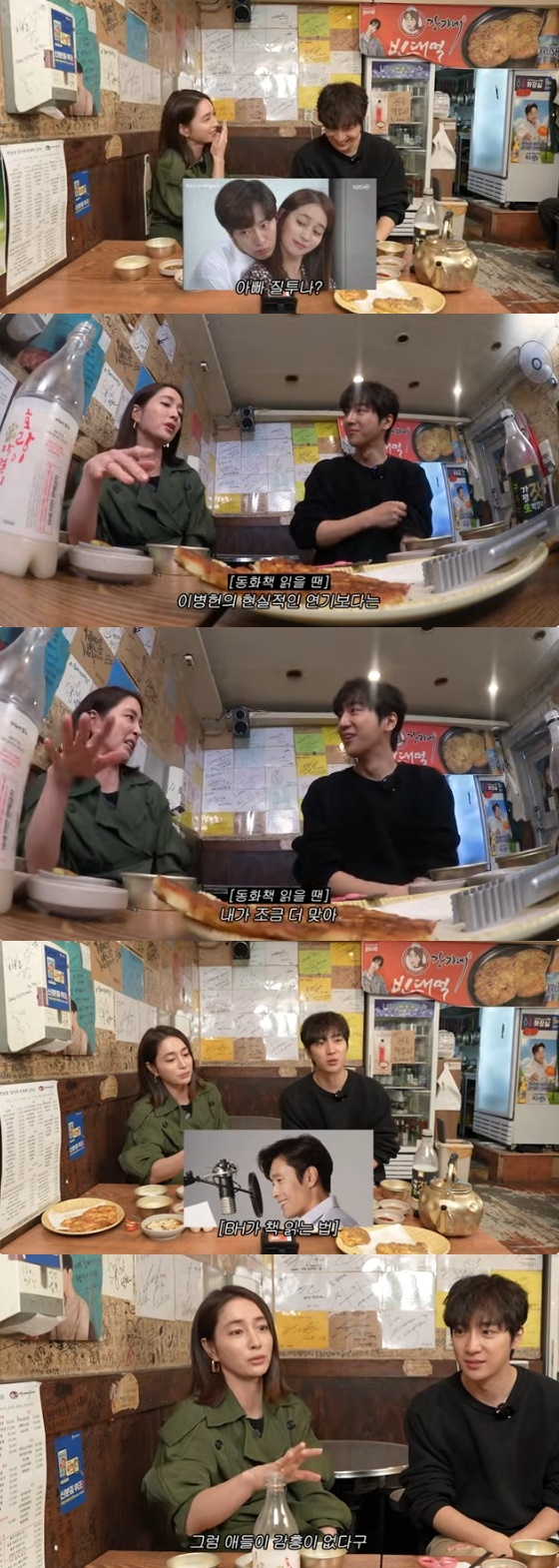 또 이병헌보다 자신이 동화구연 실력이 월등히 높다고 자부하며 "이병헌의 현실적인 연기보다는 (동화구연에)내가 더 맞는다. 현실적으로 읽어주면 애들이 감흥이 없다"고 너스레를 떨었다. 그는 각종 효과음과 과장된 목소리로 시범을 보여 현장을 폭소케 했다. 이민정은 "내가 이렇게 오바하면 오빠는 '너 연기 그렇게 할래?'라고 하지만 애들한테는 내가 더 먹힌다. 남편도 목소리를 깔고 읽다가 애들이 집중 못하면 온갖 스킬을 쓴다"고 밝혀 웃음을 자아냈다.