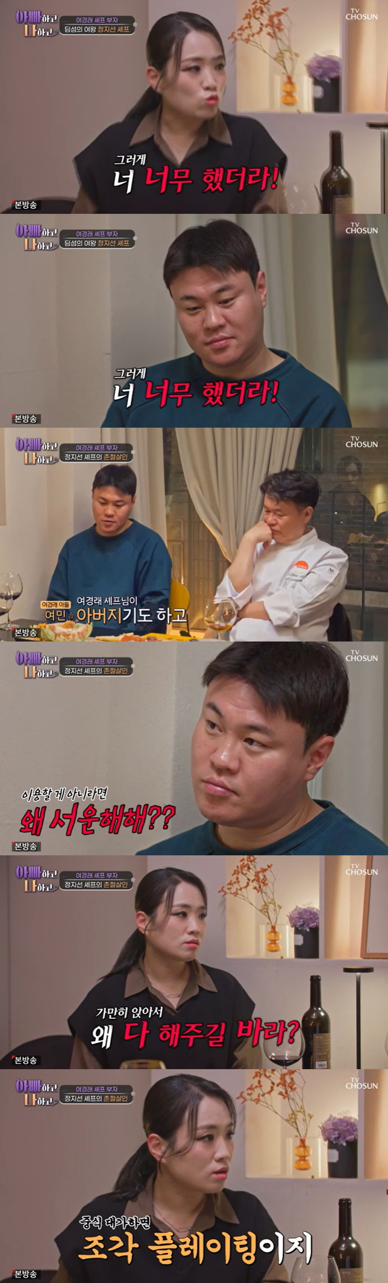여경래는 "이번에 방송에서 얘가(여민이) 나에게 '스승이라 생각해 본 적 없다'고 하더라"라고 하자 정지선은 "너 너무했더라"라고 말했다. 여민이 "나는 아빠의 제자라고 생각해 본 적이 없다"라며 "(여경래가) 아버지이기도 하고 직장 상사이기도 하니까"라고 했다.