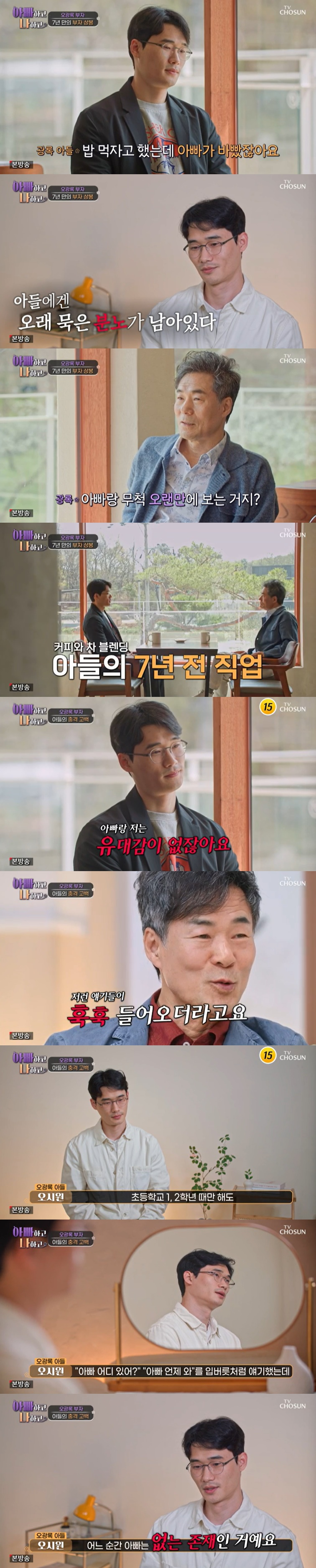 오광록은 "아빠는 시원이에 대한 유대감이 깊다. 네가 태어나기 전의 시간부터 너를 외가로 보내기 전의 시간까지 아빠 마음 속엔 추억이 있다"고 서운함을 드러냈다. 아들은 "아빠의 연락을 피해게 된 게 화가 나서인 것 같다. 그게 제 표현이었던 것 같다. 너무 화가 나서 연락을안 받아버리거나 답장도 안 받고. 아빠 전화뿐 아니라 친할머니 전화도 안 받았다. 차라리 아빠한테 화를 냈어야 했는데 안 하다 보니까 좀 곪아있던 것 같다. 원망도 했던 것 같고"라고 털어놨다.