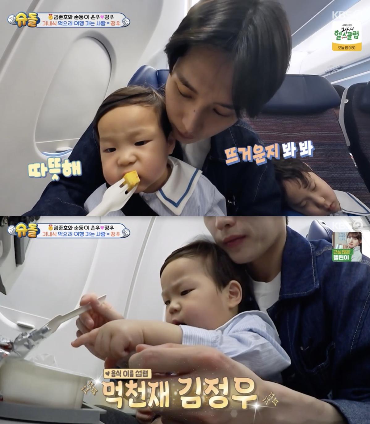 펜싱 국가대표 김준호의 아들 정우가 비행기 안에서도 폭발적인 식욕을 드러냈다.