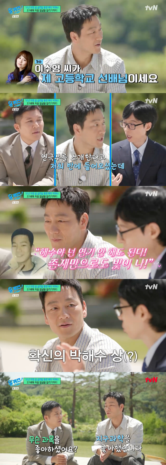 이를 들은 유재석은 "이수영이 박해수가 너무 잘생겨서 연극부원으로 뽑았고 '해수야, 넌 연기 안 해도 된다. 존재만으로 빛이 나'라고 했다고 한다"고 부연했다.