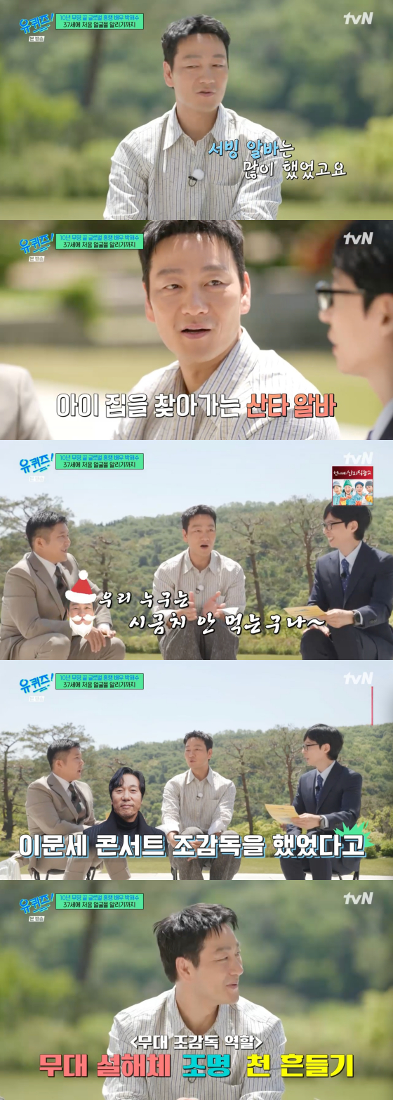 유재석이 "안 해본 알바가 없다고 하더라"고 묻자 박해수는 "서빙 알바도 많이 하고 크리스마스 때 집에 찾아가는 산타 할아버지 알바도 했었다"고 답했다.