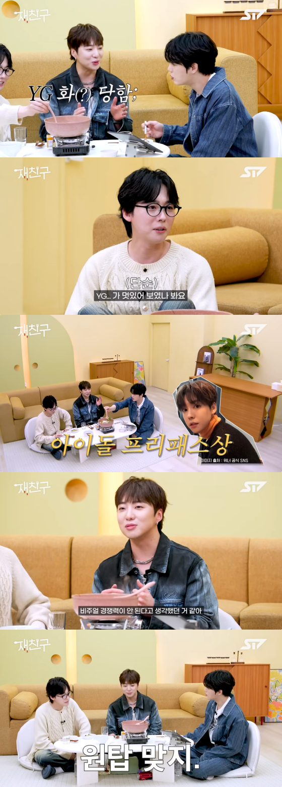 김잰우 대답을 들은 강승윤은 "그때 회사에서 이미 나왔던 그룹이 빅뱅, 투애니원이었다. 그런데 SM이나 타 기획사에서 나오는 그룹들과 비교했을 때 개성으로는 되는데 비주얼 경쟁력이 안 된다고 생각했던 것 같다"고 생각을 밝혔다.
