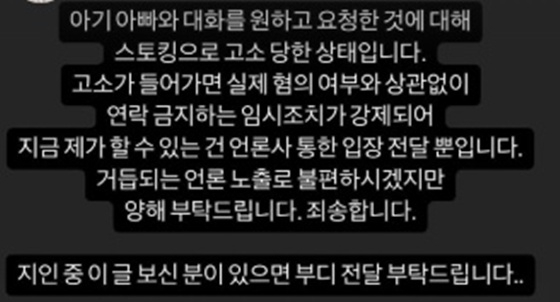 이어 "고소가 들어가면 실제 혐의 여부와 상관없이 연락 금지하는 임시 조치가 강제돼 지금 제가 할 수 있는 건 언론사를 통한 입장 전달뿐"이라며 "거듭되는 언론 노출로 불편하시겠지만 양해 부탁드린다. 죄송하다"고 전했다.