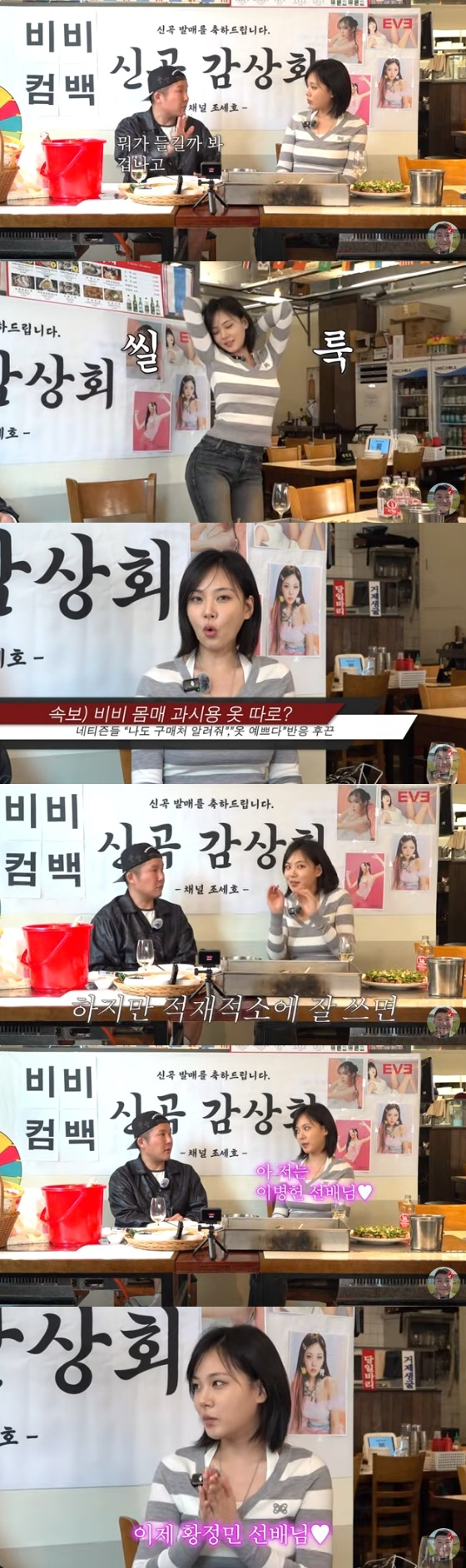 그러던 중 비비는 갑자기 자리에서 일어나 썸네일용 포즈를 취해 시선을 모았다. 그는 특유의 섹시함을 살리는 포즈를 잡으며 "썸네일로 이거하고 '몸매 과시용 옷 따로?' 이렇게 제목 붙여서 올리고 편하게 얘기하다 보면 사람들이 '언제 영상 나오나' 할 거다"라고 말해 엉뚱미를 뽐냈다.