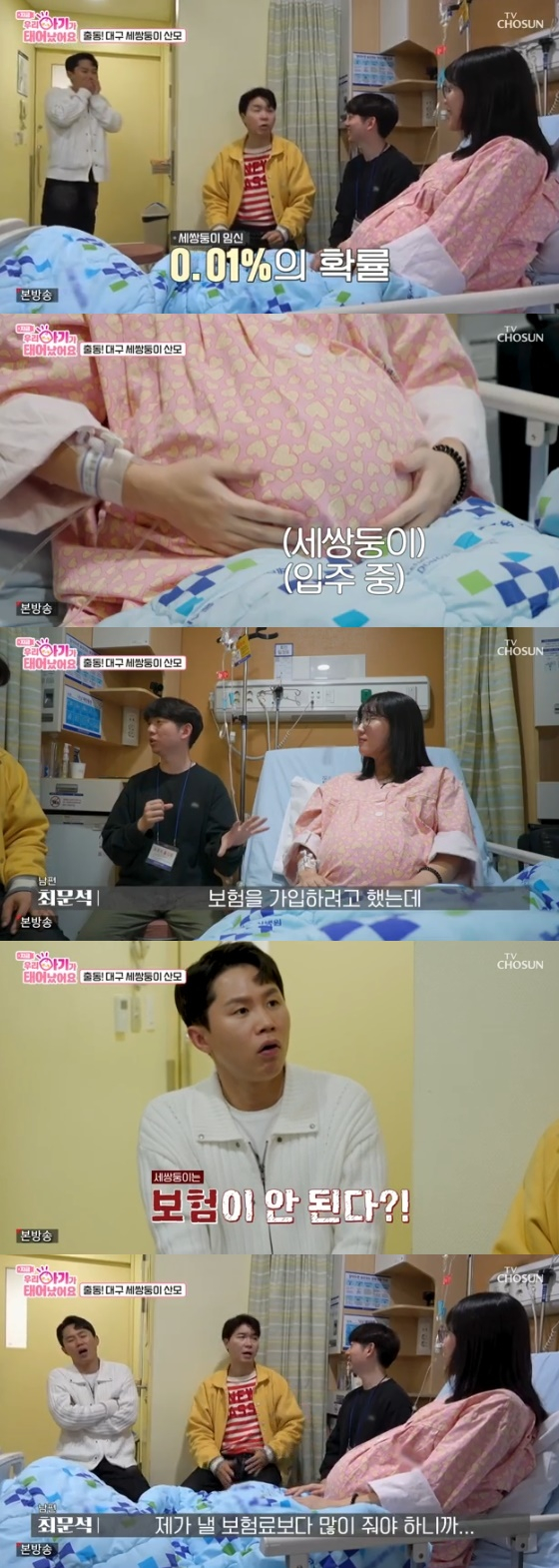 이날 박수홍과 양세형은 대구의 한 대학병원 고위험산모신생아센터에 한 달째 입원 중인 31주 차 세 쌍둥이 산모를 찾았다. MC들을 맞이한 남편은 "둘째를 기획하려다가 둘, 셋, 넷째가 생겨버렸다"라고 소개해 웃음을 자아냈다.