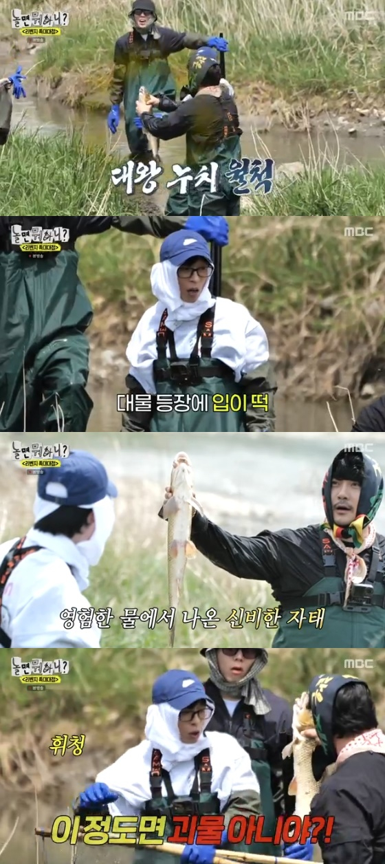 이들은 대왕 누치를 '영물'이라 칭하며 강으로 되돌려보냈다. 유재석은 "이 정도면 괴물 아니냐. 소름 돋았다"고 다시 한번 짜릿함을 만끽하는가 하면 KCM은 "발견은 재석이 형이 했지만 제가 잡았다"고 공치사해 웃음을 자아냈다.