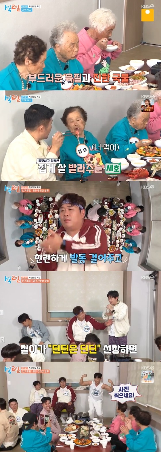 할머니들은 음식을 먹지 못하는 멤버들의 입에 몰래 음식을 넣어주며 연신 안타까움을 드러냈다. 계속되는 할머니들의 온정(?)에 제작진은 결국 개인기를 통해 인기 투표 1위에 등극한 멤버에게만 잔칫상에 합류할 기회를 주기로 했다.